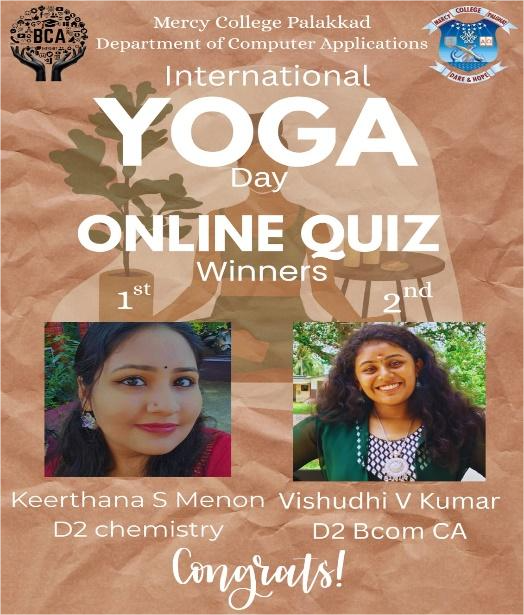 As part of the celebration of International Yoga Day, the Department of Computer Applications, Mercy College, organized an Online Yoga Quiz on Saturday, 21st June 2025. The event was open to all students across the college, aiming to spread awareness about the benefits and significance of yoga. A total of 51 students registered for the quiz, out of which around 30 students actively participated. The quiz consisted of 25 questions designed to enhance students’ knowledge about yoga—its origins, benefits, and relevance in daily life.