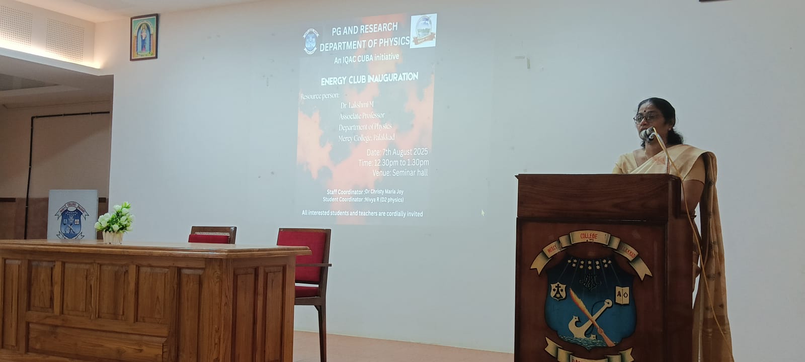 The inauguration of Energy Club of the Research and Postgraduate Department of Physics of Mercy College, Palakkad, for the year 2025-26 was held on 7th August 2025 in the Seminar Hall by Dr. Lakshmi M, Head of the Department. Niya, the coordinator of the energy club provided insight to the club activities and programs. In her inaugural address, Dr. Lakshmi emphasized the need for an Energy Club in the present global energy crisis scenario and urged the students to actively participate in the programs undertaken by the club in the campus as well as beyond. This initiative aims to promote technical learning, environmental responsibility, and practical implementation, preparing students to be future leaders in sustainable energy solutions. The enthusiastic involvement of both students and faculty contributed significantly to the program’s great success.