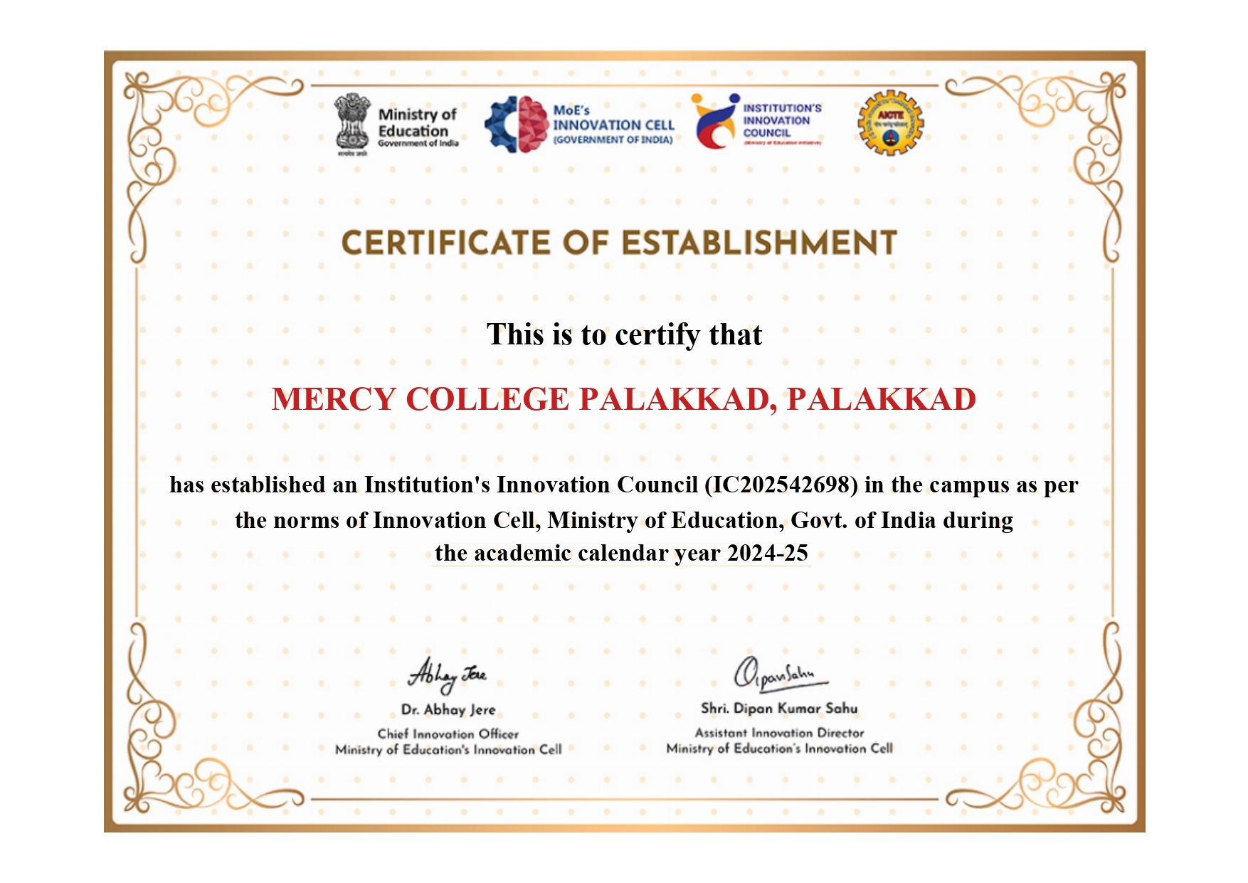 The Institution Innovation Council (IIC) at Mercy College, Palakkad, was established in the academic year 2024–2025 as part of the nationwide initiative launched by the Ministry of Education (MoE), Government of India, through the Innovation Cell (MIC). The primary objective of the IIC is to systematically foster a culture of innovation, design thinking, entrepreneurship, and start-up ecosystem within the campus.